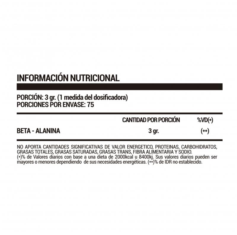 La Beta-Alanina es un aminoácido que en el organismo se transforma en Carnosina, la cual actúa como regulador (efecto tapón) en la producción de Ácido Láctico y como antioxidante en estrés oxidativo. Disminuye la fatiga muscular y aumenta la resistencia en ejercicios de alta intensidad. El consumo en conjunto con Creatina amplifica los efectos de ambos productos.