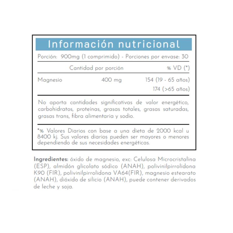 Magnesio 400 de Natuliv cubre el requerimiento diario, aportando 400 mg de Óxido de Magnesio por comprimido.
