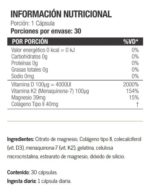 Ingredientes: Citrato de magnesio, Colágeno tipo II, colecalciferol (vit. D3), menaquinona-7 (vit. K2), gelatina, celulosa microcristalina, estearato de magnesio, dióxido de silicio.